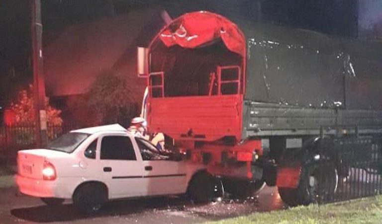 Un conductor en estado de ebriedad protagonizó un aparatoso accidente vehicular, tras lo cual su automóvil terminó debajo de un camión militar, en la comuna de Paillaco.