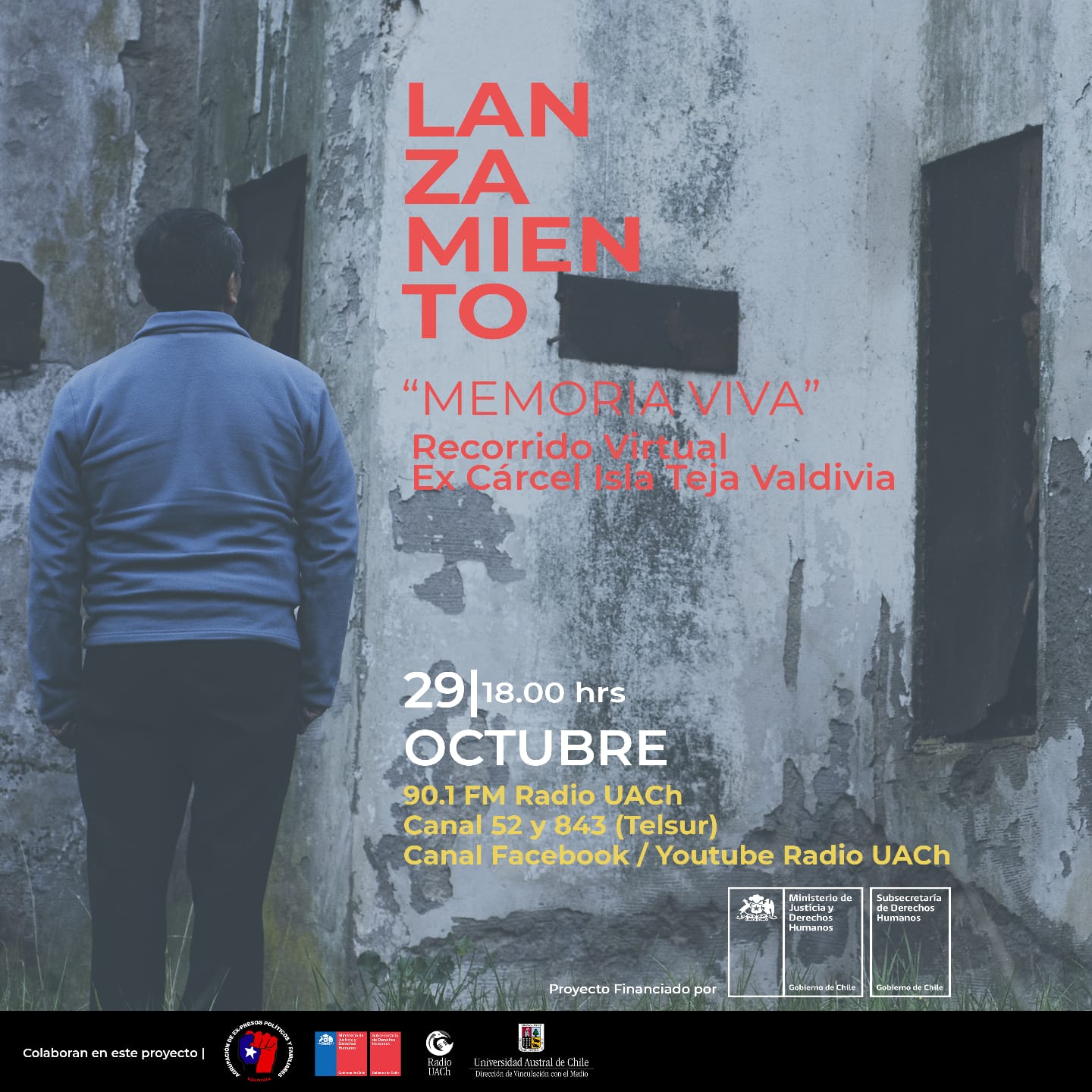 El proyecto “Memoria Viva: recorrido virtual ex cárcel Isla Teja” será lanzado el viernes 29 de octubre a las 18:00 hrs. Por los canales de Facebook y Youtube de Radio UACh, canal 52 y 843 de Telsur. Además se suma a esta transmisión Valdivia Tv canal Municipal de Valdivia.